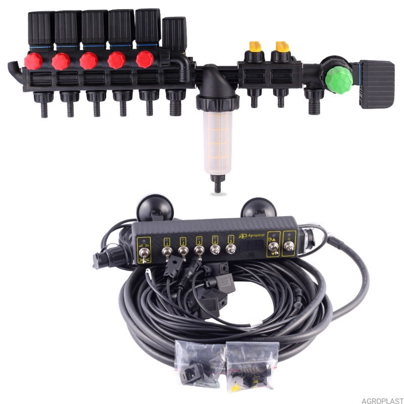Komplet zawiera Rozdzielacz sekcyjny HD z elektrozaworami oraz sterownik 5-sekcyjny.